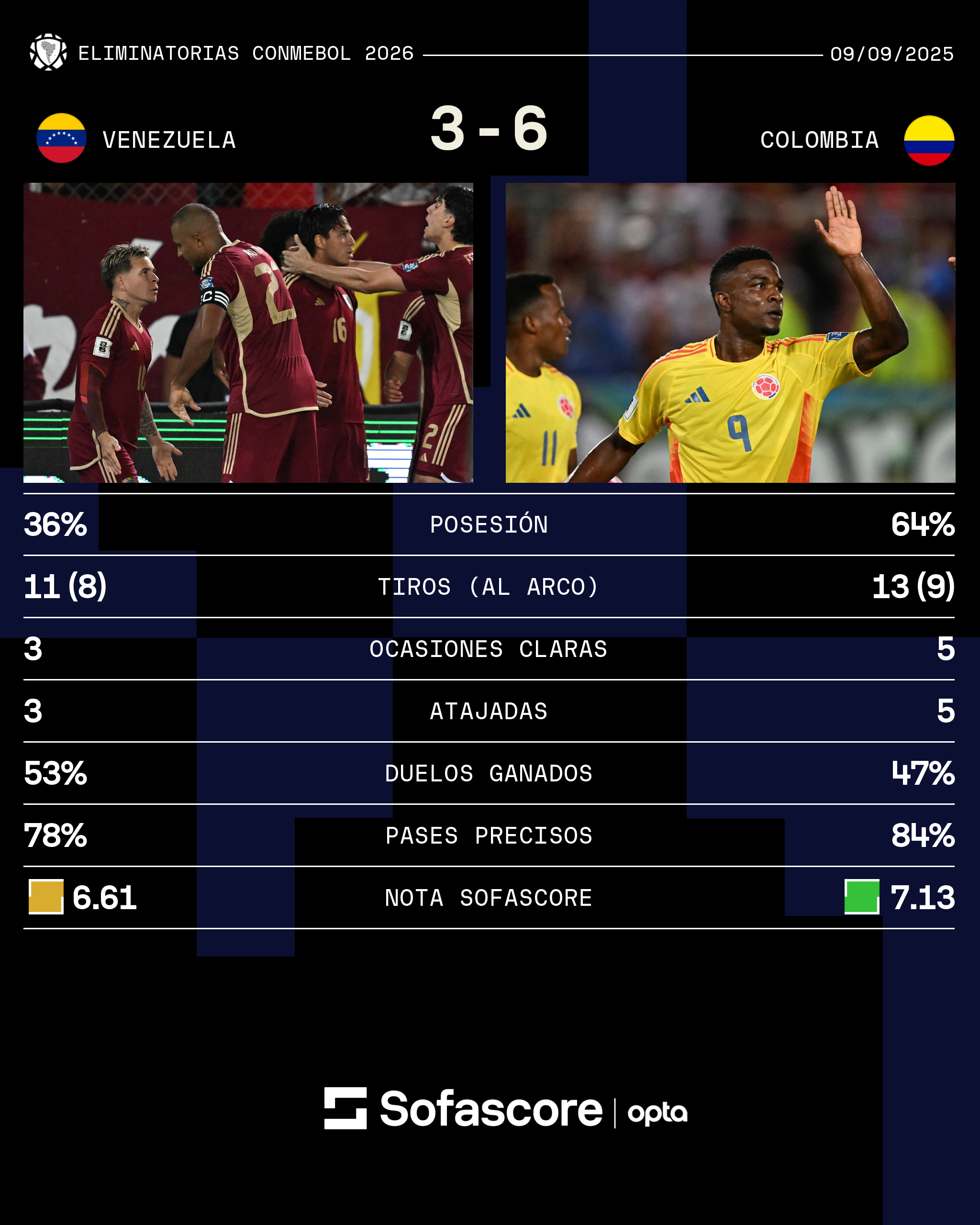 Luis Suárez, que fue la gran pesadilla para la Vinotinto, anotó a los 49 minutos en un contragolpe letal. La defensa venezolana llegó tarde y Colombia capitalizó.